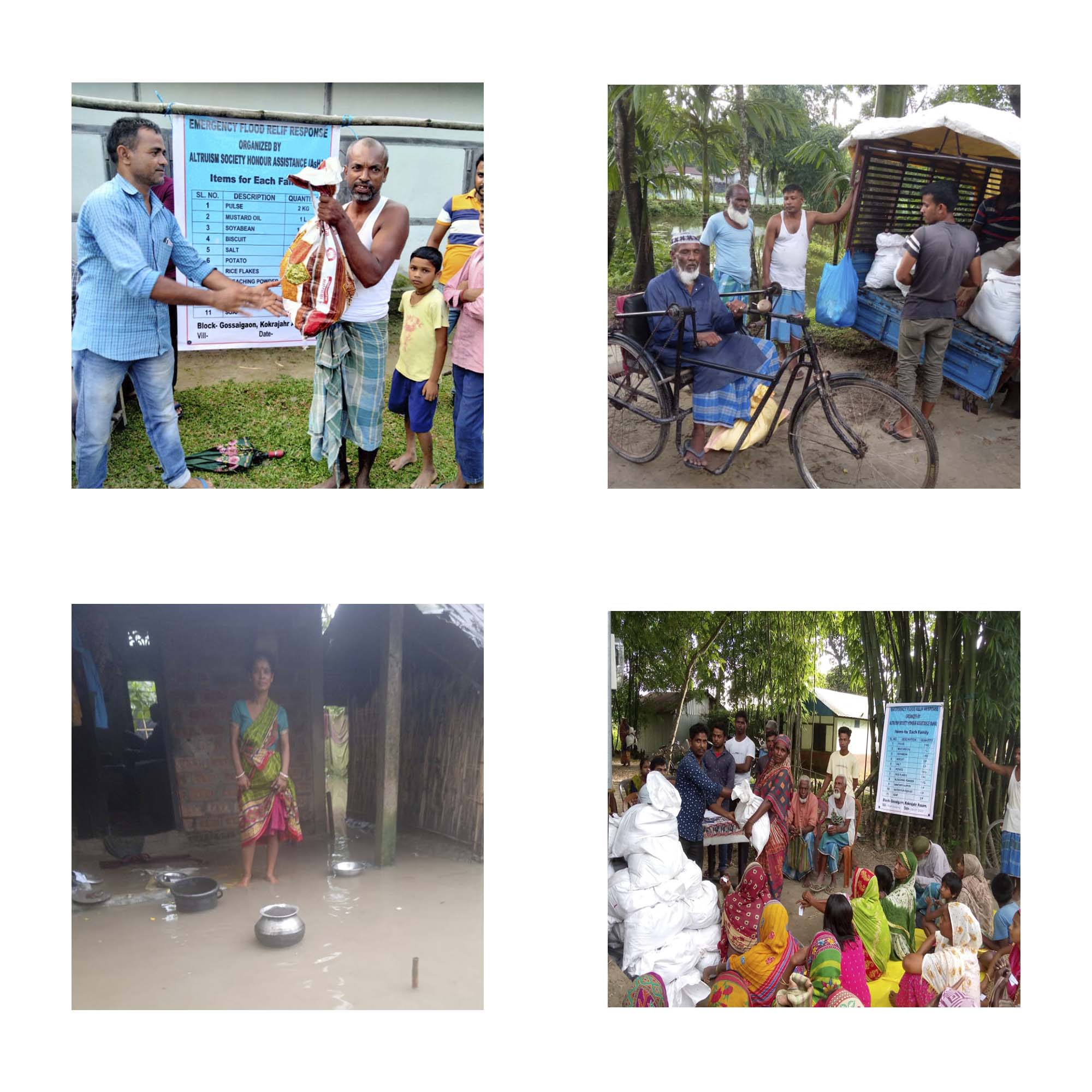 Following disastrous floods produced by relentless pre-monsoon and monsoon rains in Assam in 2023, Kokrajhar district faced significant issues, with 258 villages flooded. The situation quickly deteriorated, endangering both human life and the fragile ecosystem. Sentinel Assam has widely reported on the escalating catastrophe, highlighting the hardship of impacted villages and the critical need for relief measures. The floods not only submerged vast swathes of land but also displaced numerous families, compelling them to seek shelter on higher ground, including roadside areas. Vulnerable sections of society, including widows, individuals with prolonged illnesses, physically challenged persons, and those whose homes were damaged, found themselves particularly at risk during and after the floods. With the monsoon season ongoing, there remained a looming threat of further devastation, exacerbating the challenges faced by the most vulnerable. Altruism Society Honour Assistance (AsHA), with a history of active involvement in disaster management, swiftly responded to the crisis. Recognizing the urgent need for assistance, AsHA mobilized resources to provide relief to flood-affected families in the Gossaigaon block of Kokrajhar district. Leveraging partnerships with reputable organizations such as GOONJ and the Azim Premji Foundation (APF), AsHA successfully secured 1450 relief kits to distribute among affected households.